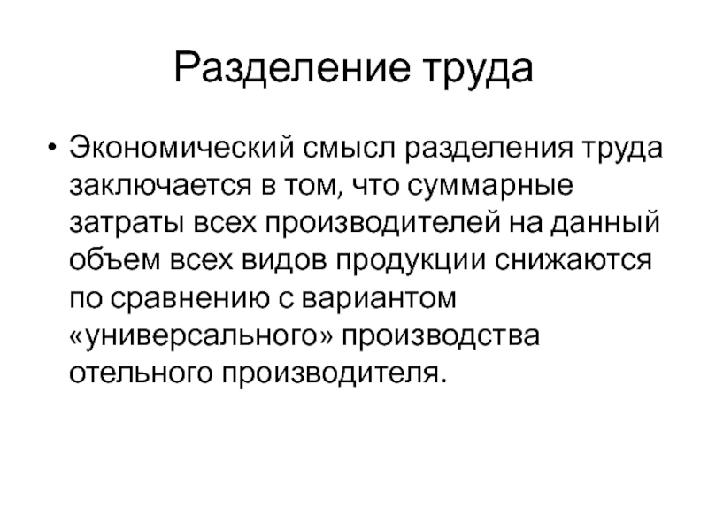 Разделение труда Экономический смысл разделения труда заключается в том, что суммарные затраты всех производителей на данный объем