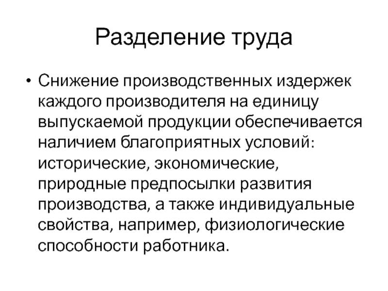 Разделение трудаСнижение производственных издержек каждого производителя на единицу выпускаемой продукции обеспечивается наличием благоприятных условий: исторические, экономические, природные