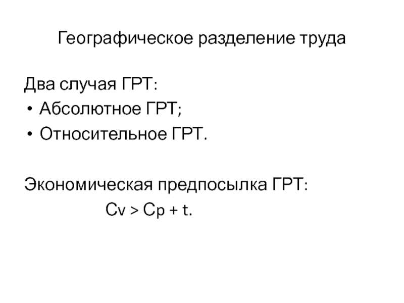 Географическое разделение трудаДва случая ГРТ:Абсолютное ГРТ;Относительное ГРТ.Экономическая предпосылка ГРТ: 				Сv > Сp + t.