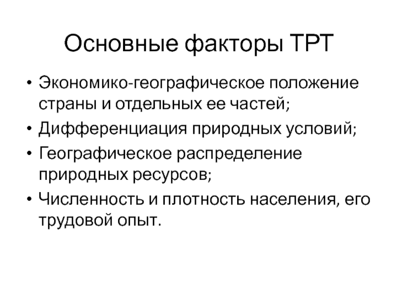 Основные факторы ТРТЭкономико-географическое положение страны и отдельных ее частей;Дифференциация природных условий;Географическое распределение природных ресурсов;Численность и плотность населения,