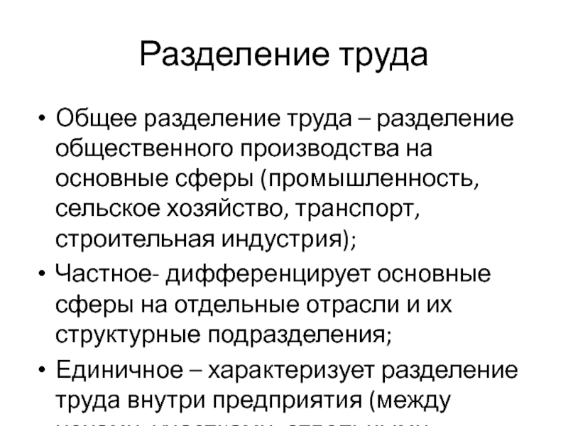 Разделение трудаОбщее разделение труда – разделение общественного производства на основные сферы (промышленность, сельское хозяйство, транспорт, строительная индустрия);Частное-