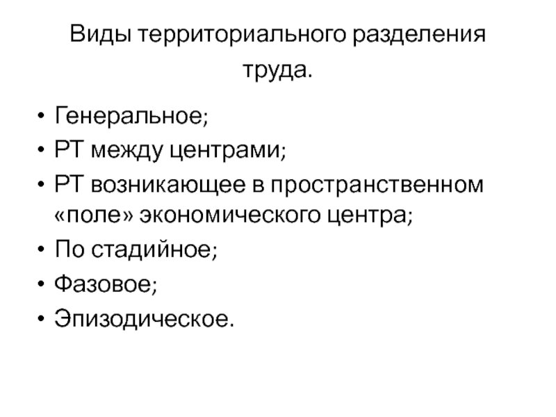 Виды территориального разделения труда. Генеральное;РТ между центрами;РТ возникающее в пространственном «поле» экономического центра;По стадийное;Фазовое;Эпизодическое.