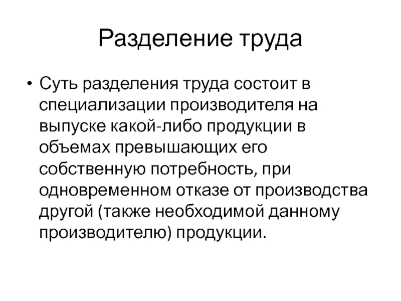 Разделение трудаСуть разделения труда состоит в специализации производителя на выпуске какой-либо продукции в объемах превышающих его собственную