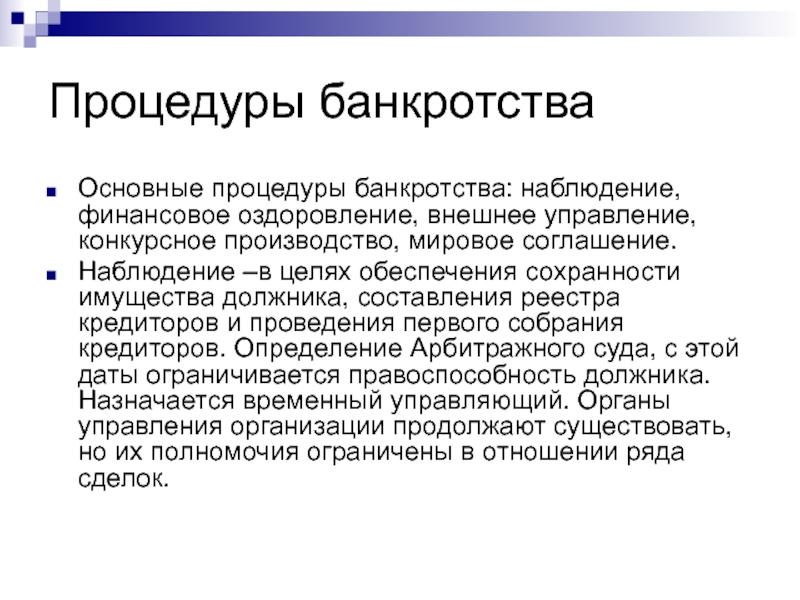 Основные процедуры банкротства: наблюдение, финансовое оздоровление, внешнее управление, конкурсное