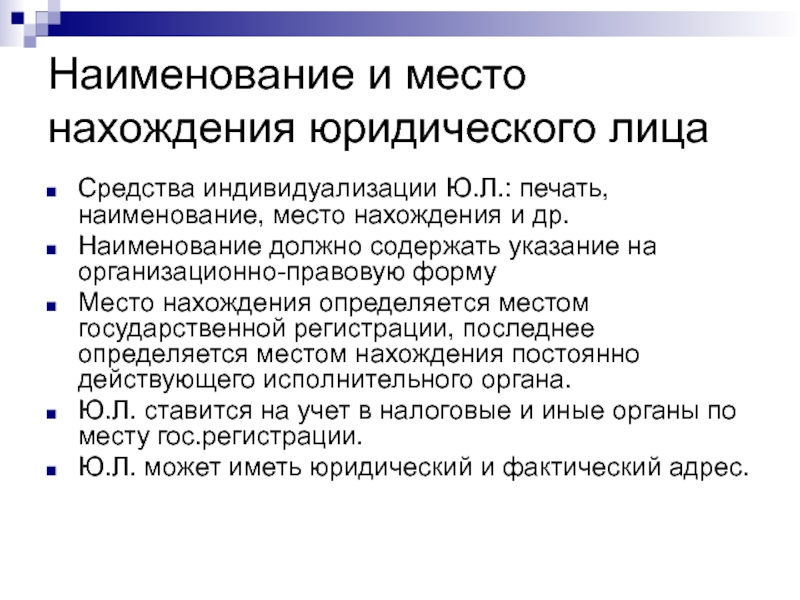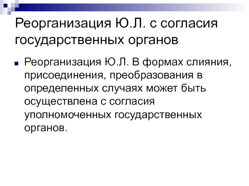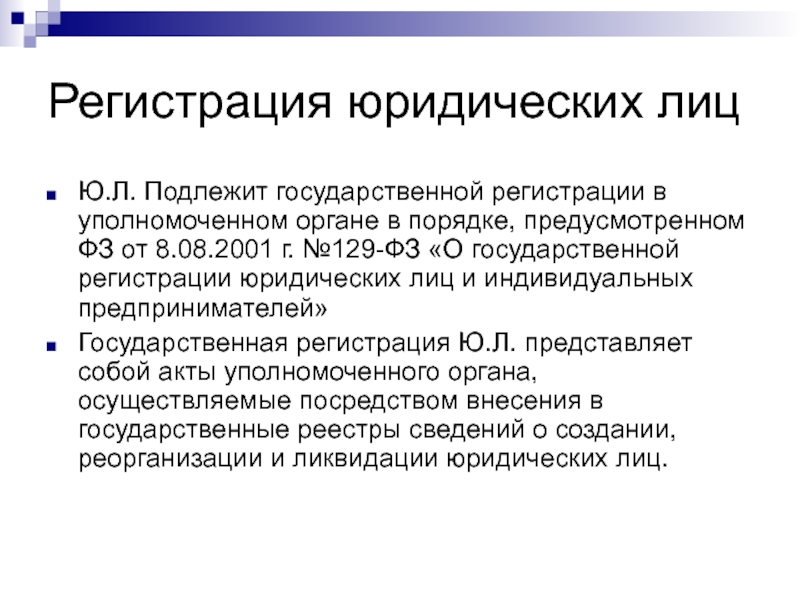 Государственная регистрация Ю.Л. представляет собой акты уполномоченного органа, осуществляемые посредством внесения в государственные реестры сведений о создании, реорганизации и ликвидации юридических лиц.