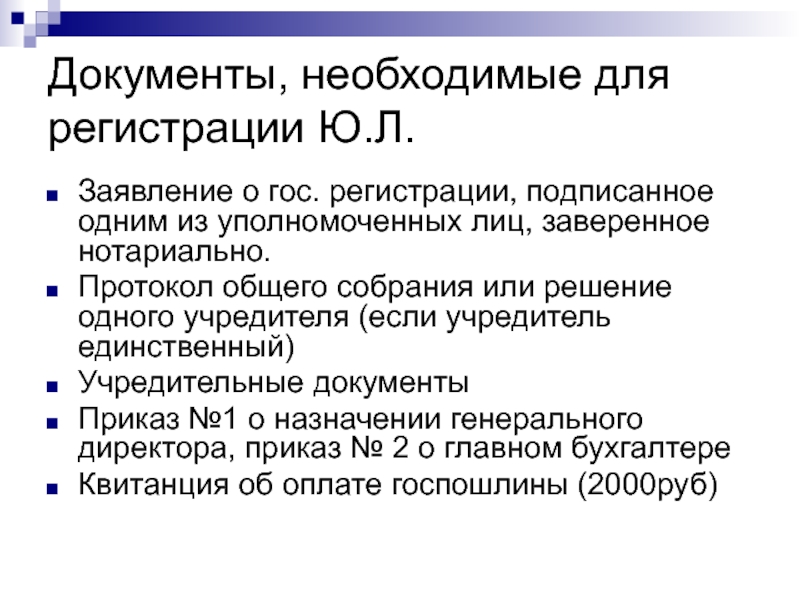 Слайд 15Документы, необходимые для регистрации Ю.Л.