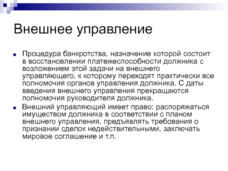 Внешний управляющий имеет право: распоряжаться имуществом должника в соответствии с планом внешнего управления, предъявлять требования о признании сделок недействительными, заключать мировое соглашение и т.п.