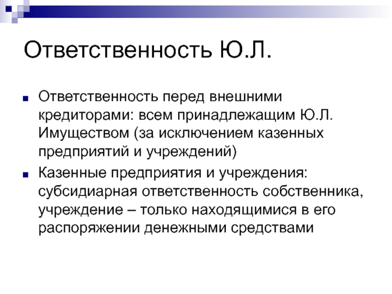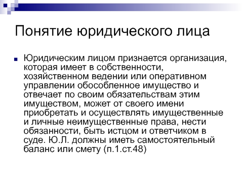 своим обязательствам этим имуществом, может от своего имени приобретать и осуществлять имущественные и личные неимущественные права, нести обязанности, быть истцом и ответчиком в суде. Ю.Л. должны иметь самостоятельный баланс или смету (п.1.ст.48)