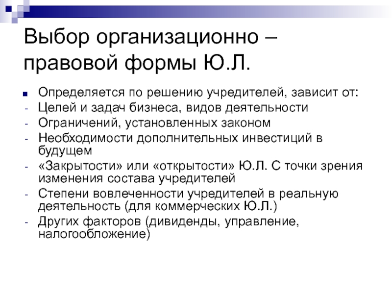 Слайд 17Выбор организационно –правовой формы Ю.Л.