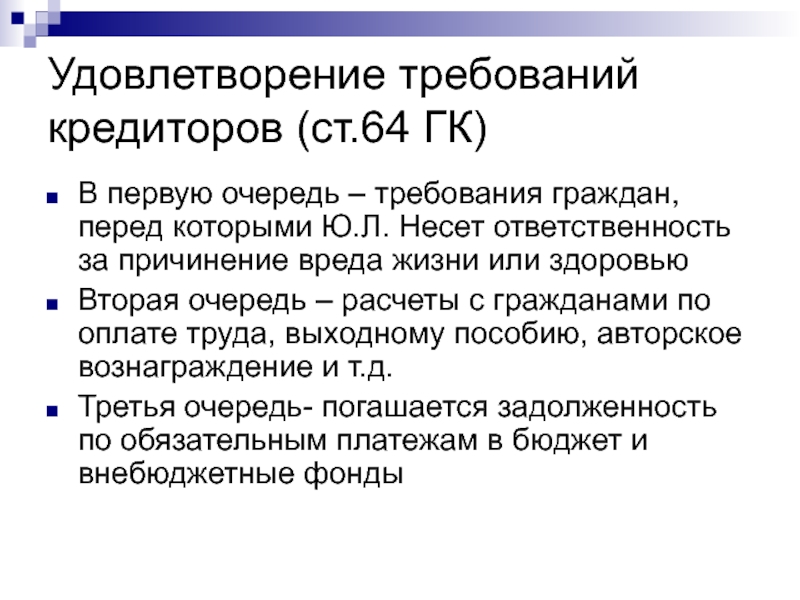 Слайд 37Удовлетворение требований кредиторов (ст.64 ГК)