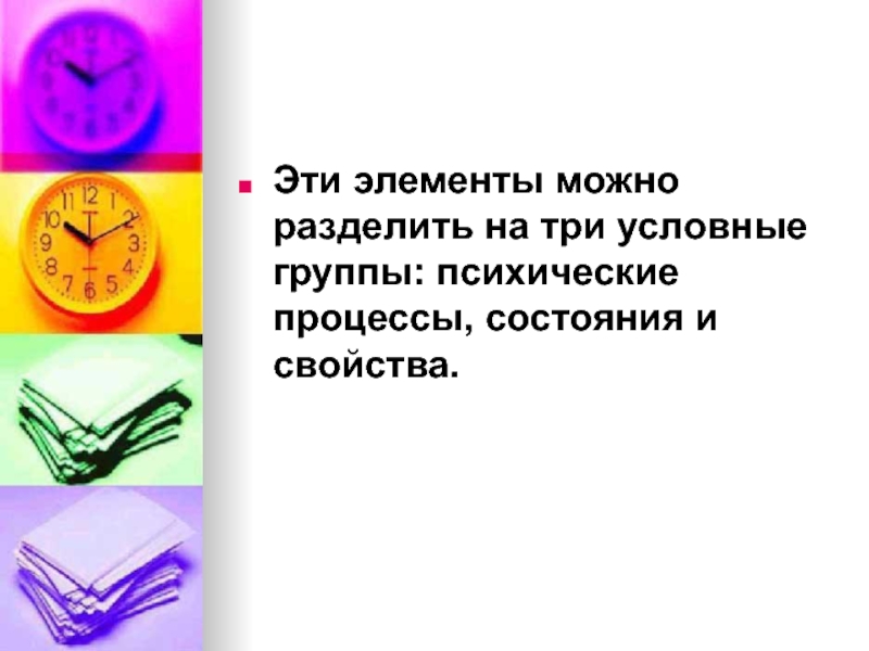 Эти элементы можно разделить на три условные группы: психические процессы, состояния и свойства.