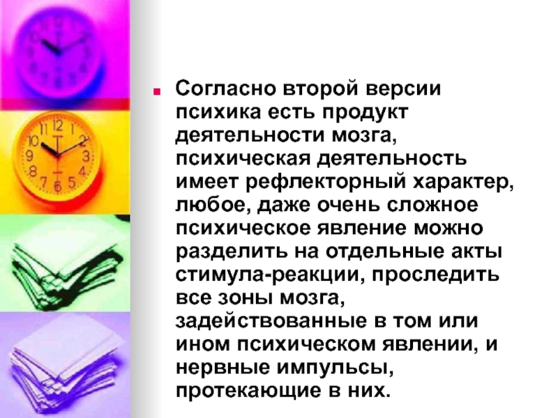 Согласно второй версии психика есть продукт деятельности мозга, психическая деятельность имеет рефлекторный характер, любое, даже очень сложное