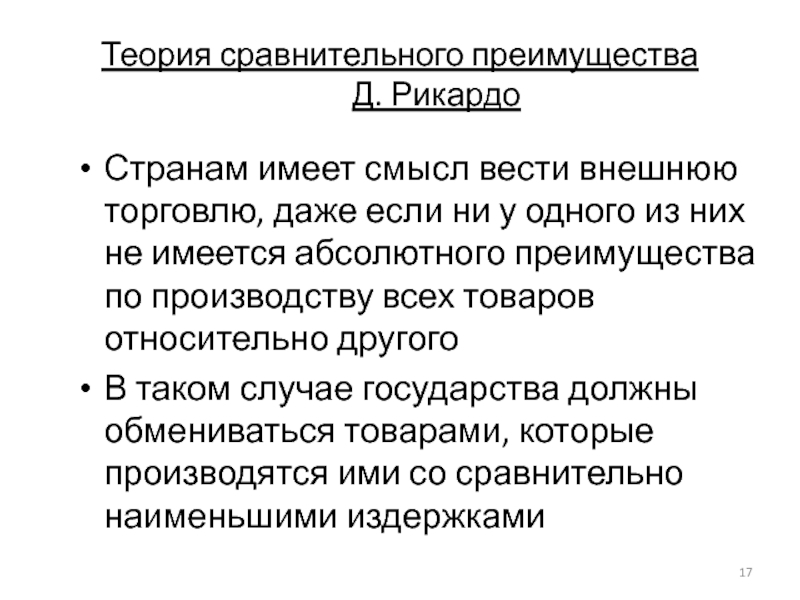 В таком случае государства должны обмениваться товарами, которые производятся ими со сравнительно наименьшими издержками