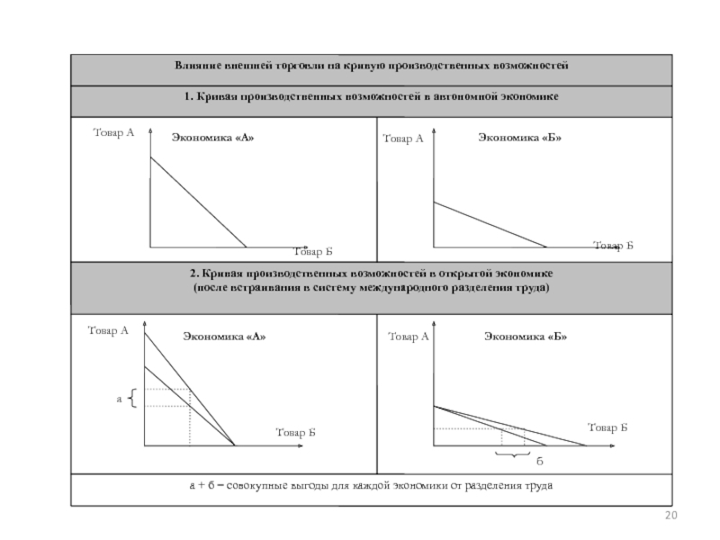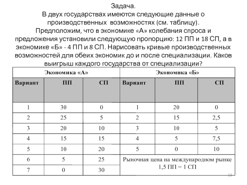 следующую пропорцию: 12 ПП и 18 СП, а в экономике «Б» - 4 ПП и 8 СП. Нарисовать кривые производственных возможностей для обеих экономик до и после специализации. Каков выигрыш каждого государства от специализации?