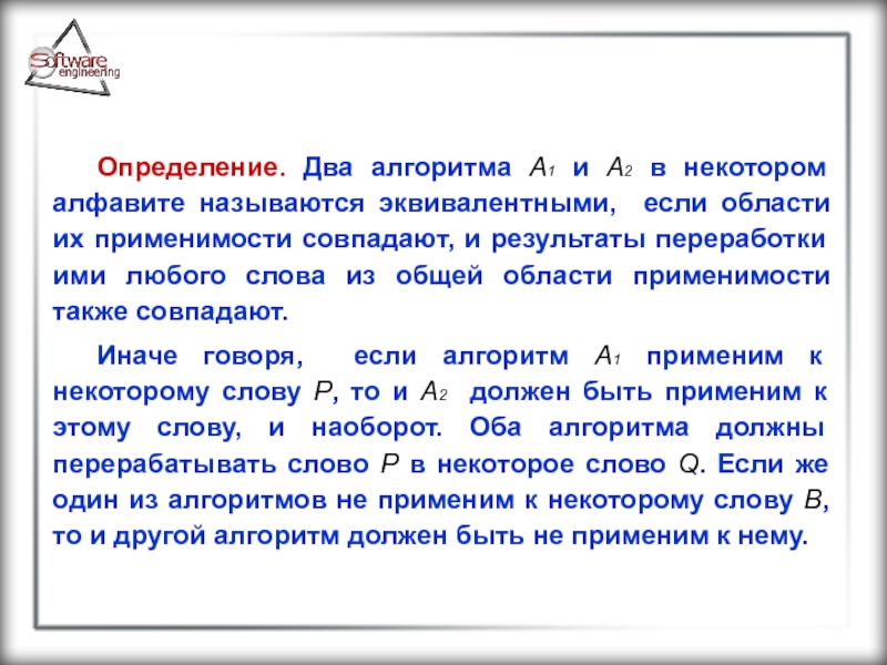 Иначе говоря, если алгоритм A1 применим к некоторому слову Р, то и A2 должен быть применим к этому слову, и наоборот. Оба алгоритма должны перерабатывать слово Р в некоторое слово Q. Если же один из алгоритмов не применим к некоторому слову B, то и другой алгоритм должен быть не применим к нему.