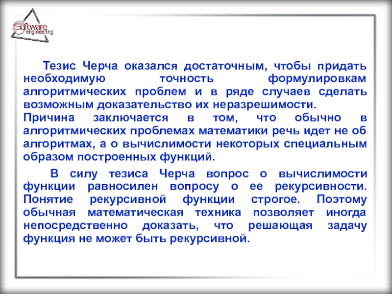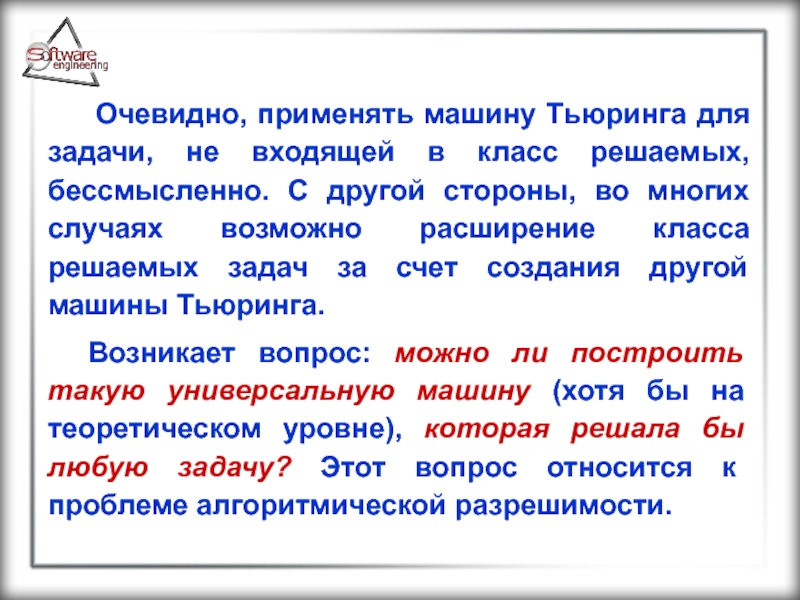 То есть задача считается алгоритмически неразрешимой, если не существует машины Тьюринга, или рекурсивной функции, или нормального алгоритма Маркова, которой ее решает, что естественным образом вытекает из уже показанной ранее эквивалентности алгоритмических моделей.