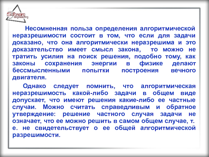 Однако следует помнить, что алгоритмическая неразрешимость какой-либо задачи в общем виде допускает, что имеют решения какие-либо ее частные случаи. Можно считать справедливым и обратное утверждение: решение частного случая задачи не означает, что ее можно решить в самом общем случае, т.е. не свидетельствует о ее общей алгоритмической разрешимости.
