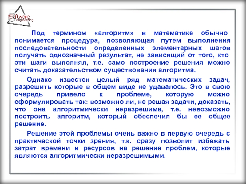 его существования просто не имело смысла. Построение такого определения, как мы знаем, привело к появлению формальных алгоритмических моделей, что дало возможность математического доказательства неразрешимости ряда задач.