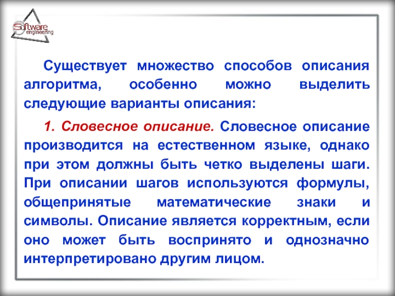 1. Словесное описание. Словесное описание производится на естественном языке, однако