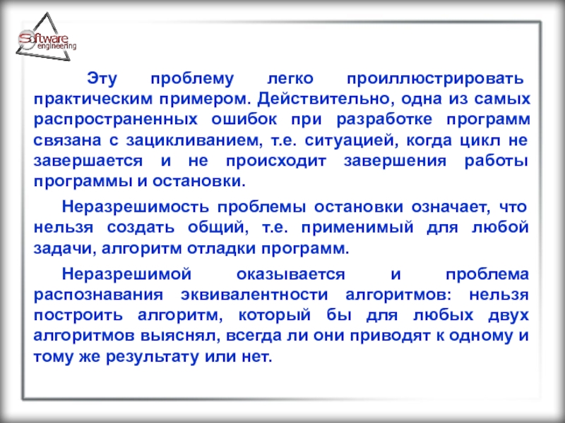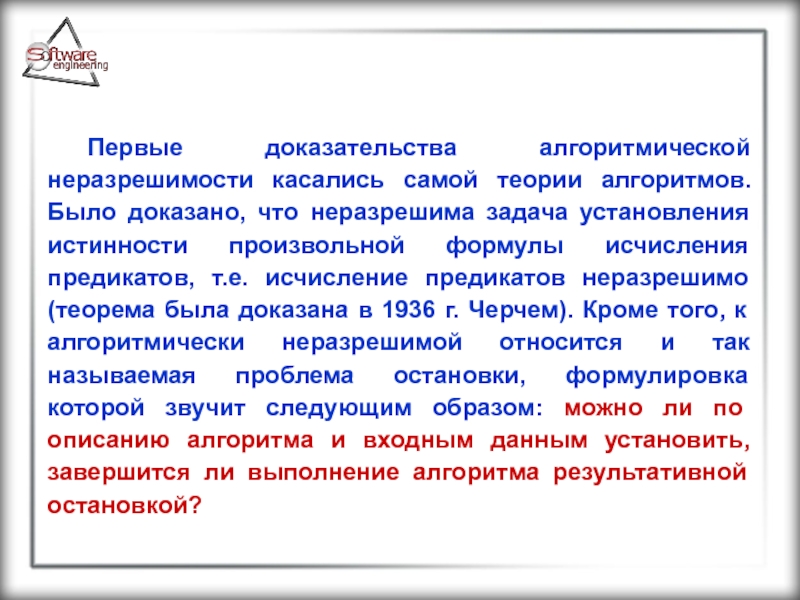 исчисление предикатов неразрешимо (теорема была доказана в 1936 г. Черчем). Кроме того, к алгоритмически неразрешимой относится и так называемая проблема остановки, формулировка которой звучит следующим образом: можно ли по описанию алгоритма и входным данным установить, завершится ли выполнение алгоритма результативной остановкой?