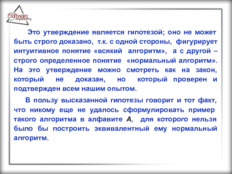 а с другой – строго определенное понятие «нормальный алгоритм». На это утверждение можно смотреть как на закон, который не доказан, но который проверен и подтвержден всем нашим опытом.