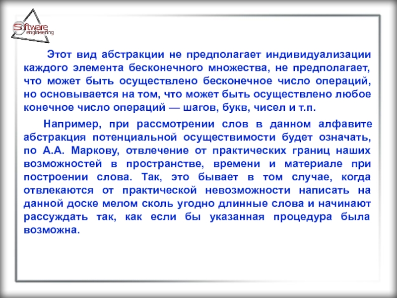 Например, при рассмотрении слов в данном алфавите абстракция потенциальной осуществимости будет означать, по А.А. Маркову, отвлечение от практических границ наших возможностей в пространстве, времени и материале при построении слова. Так, это бывает в том случае, когда отвлекаются от практической невозможности написать на данной доске мелом сколь угодно длинные слова и начинают рассуждать так, как если бы указанная процедура была возможна.