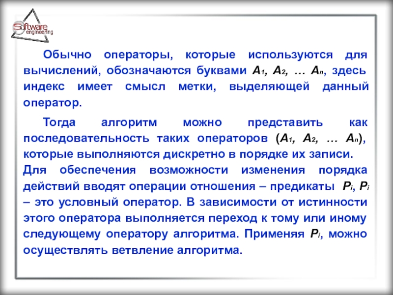 Тогда алгоритм можно представить как последовательность таких операторов (A1, A2, … An), которые выполняются дискретно в порядке их записи. Для обеспечения возможности изменения порядка действий вводят операции отношения – предикаты Pi, Pi – это условный оператор. В зависимости от истинности этого оператора выполняется переход к тому или иному следующему оператору алгоритма. Применяя Pi, можно осуществлять ветвление алгоритма.
