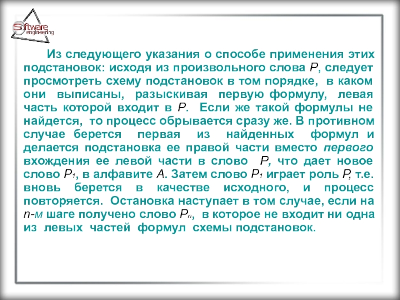 подстановок в том порядке, в каком они заданы в схеме, разыскивая формулу с левой частью, входящей в Р. Если такой формулы не найдется, то процесс обрывается. В противном случае берется первая из таких формул и делается подстановка ее правой части вместо первого вхождения ее левой части в Р, что дает новое слово Р1 в алфавите А. После только что выполненного первого шага процесса приступают ко второму его шагу, отличающемуся от первого только тем, что роль Р играет Р1. Далее делают аналогичный третий шаг и т.д. до тех пор, пока не придется оборвать процесс. Оборваться же он может лишь двумя способами: во-первых, когда получим такое слово Рn, что ни одна из левых частей формул схемы подстановок не будет в него входить; во-вторых, когда при получении слова Рn придется применить последнюю формулу. В обоих этих случаях мы считаем, что наш алгоритм перерабатывает слово Р в слово Рn.