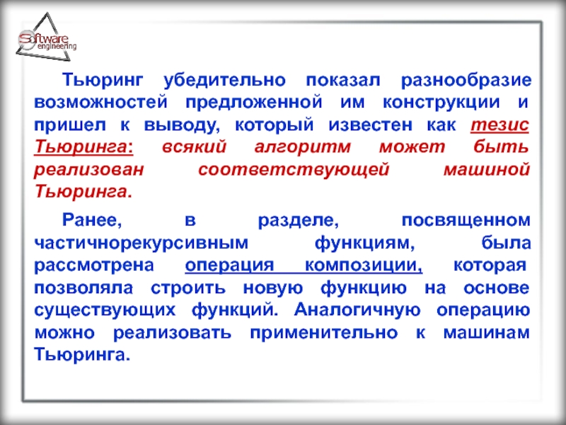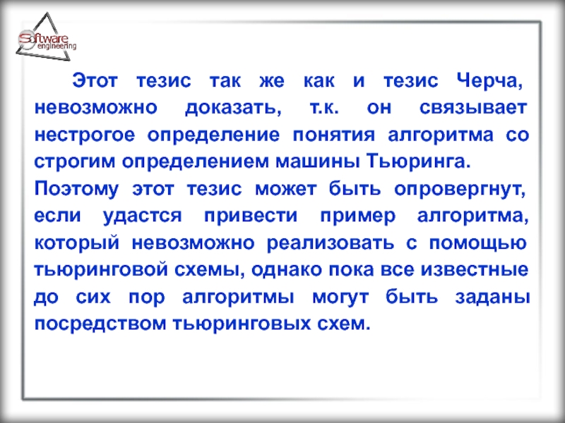 Далее последовал тезис Тьюринга, утверждавший, что для всякой вычислимой функции можно построить машину Тьюринга, которая ее вычисляет.