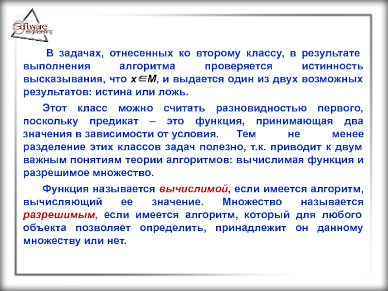 Этот класс можно считать разновидностью первого, поскольку предикат – это функция, принимающая два значения в зависимости от условия. Тем не менее разделение этих классов задач полезно, т.к. приводит к двум важным понятиям теории алгоритмов: вычислимая функция и разрешимое множество.