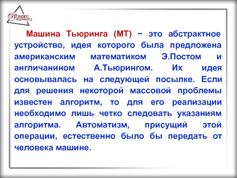 сделано английским математиком Аланом Тьюрингом (Turing) в 1937 году. Он предложил самую общую и вместе с тем самую простую концепцию вычислительной машины.