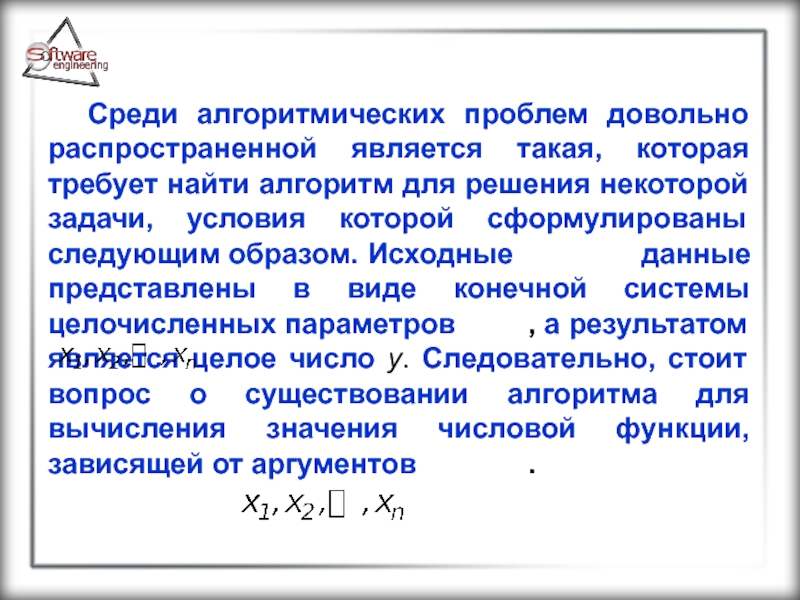 Исходные данные представлены в виде конечной системы целочисленных параметров , а результатом является целое число y. Следовательно, стоит вопрос о существовании алгоритма для вычисления значения числовой функции, зависящей от аргументов .