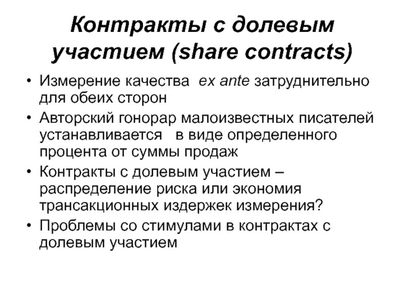 Контракты с долевым участием – распределение риска или экономия трансакционных издержек измерения?