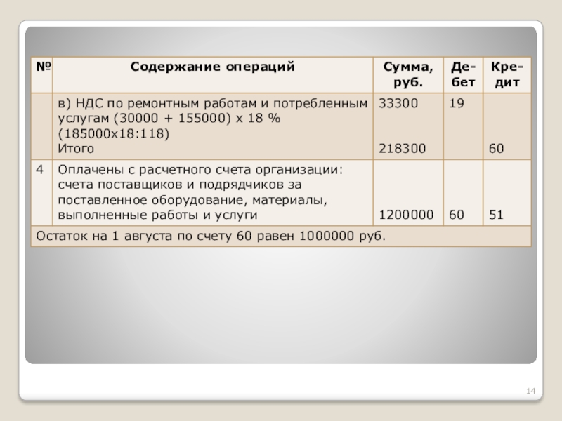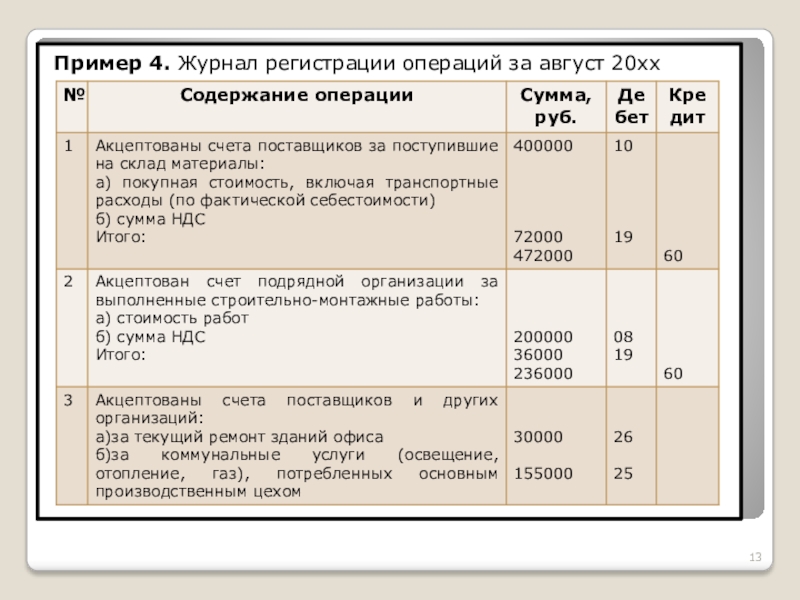 Слайд 13Пример 4. Журнал регистрации операций за август 20хх