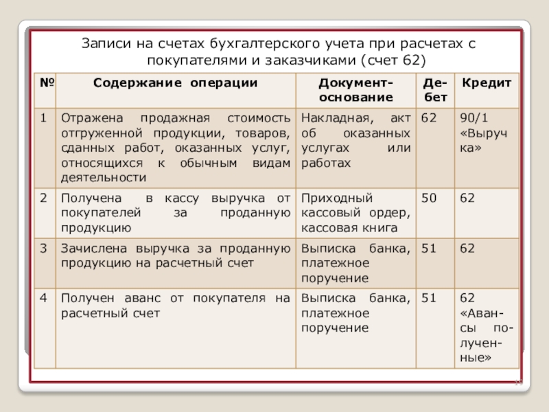 Учет дебиторской задолженности по расчетам с покупателями и заказчиками производится на активно-пассивном счете 62 «Расчеты с покупателями и заказчиками» (счет основной, счет расчетов).