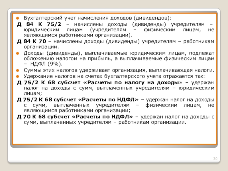 Слайд 30Бухгалтерский учет начисления доходов (дивидендов):