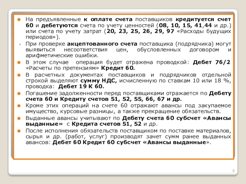 Слайд 8На предъявленные к оплате счета поставщиков кредитуется счет 60 и