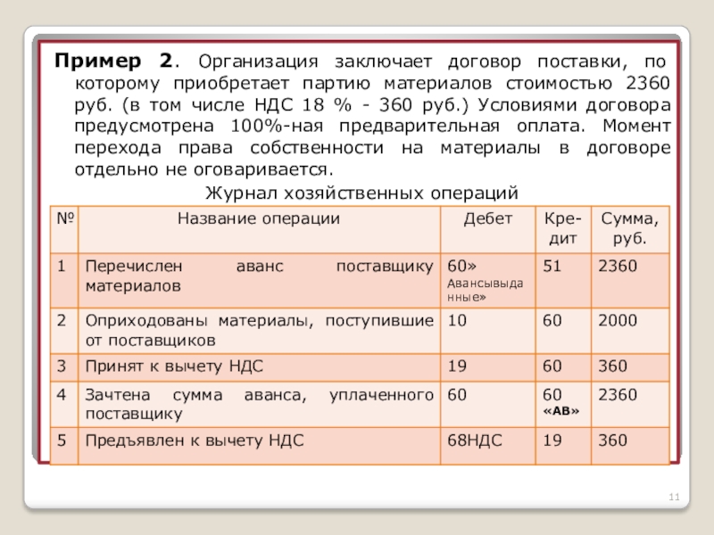 Слайд 11Пример 2. Организация заключает договор поставки, по которому приобретает партию