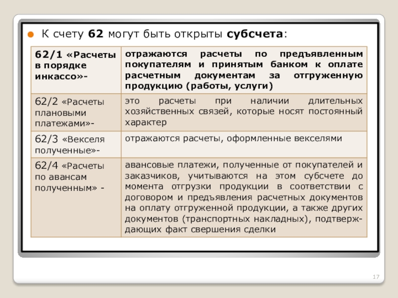 Слайд 17К счету 62 могут быть открыты субсчета: