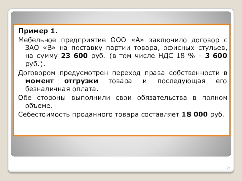 Слайд 10Пример 1. Организация заключает договор поставки, по которому приобретает партию