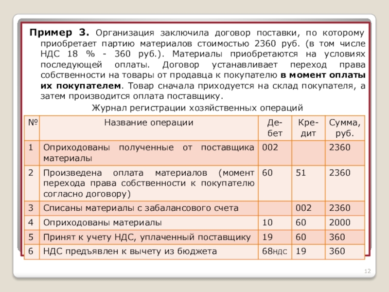 Слайд 12Пример 3. Организация заключила договор поставки, по которому приобретает партию