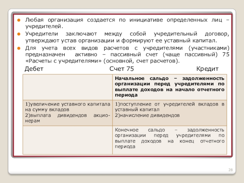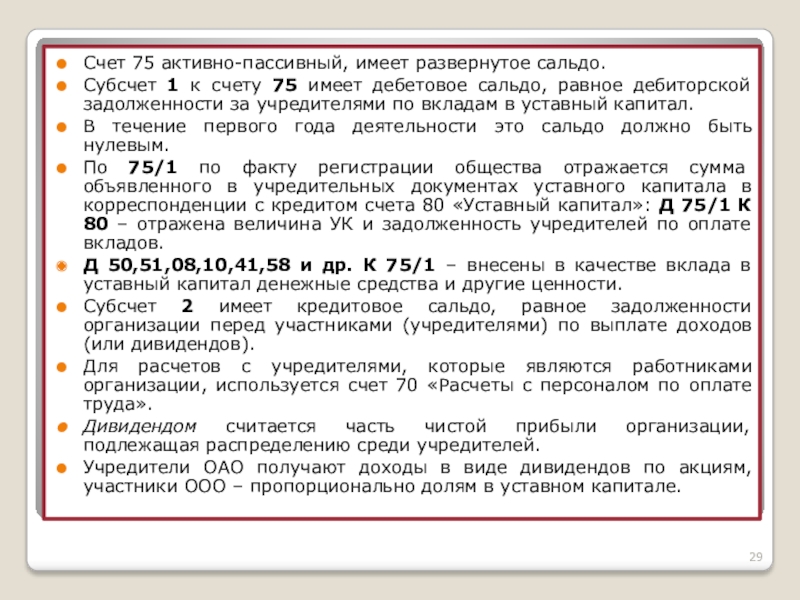 Слайд 29Счет 75 активно-пассивный, имеет развернутое сальдо.