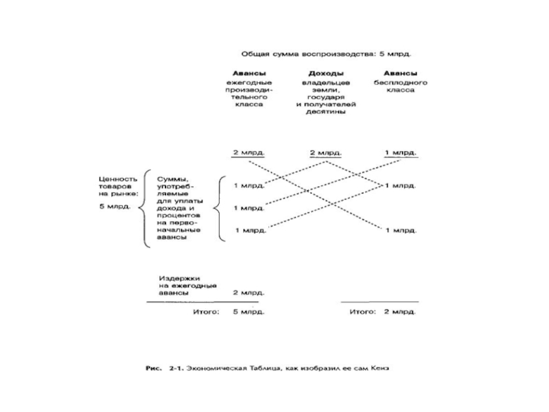 Акт первый. Фермеры продают землевладельцам предметы питания на сумму 1 миллиард ливров. В результате этого обмена к фермерам притекают деньги 1 миллиард ливров, а землевладельцы получают предметы питания на сумму 1 миллиард ливров.