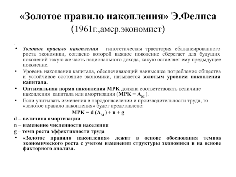 «Золотое правило накопления» лежит в основе обоснования темпов экономического роста с учетом изменения структуры экономики и на основе факторного анализа.