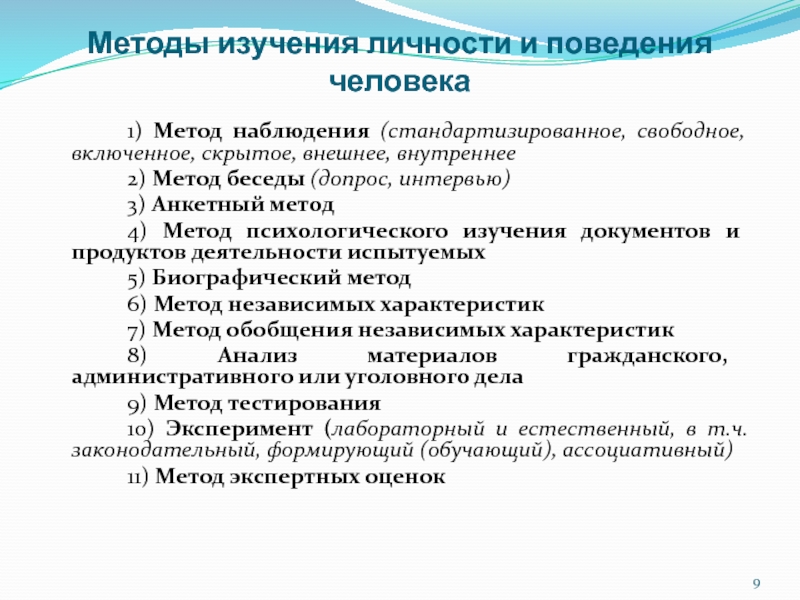 психодиагностические — тесты, анкеты, опросники, беседа;