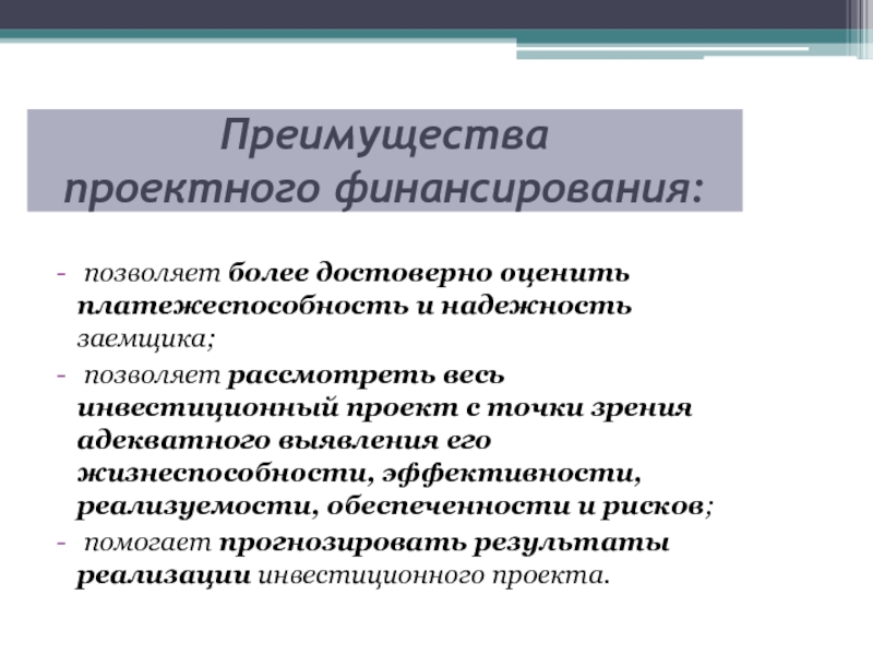 долгий период до принятия решения о финансировании, что связано с тщательной оценкой предпроектной документации банком и большим объемом работ по организации финансирования (создание банковского консорциума и т. д.);