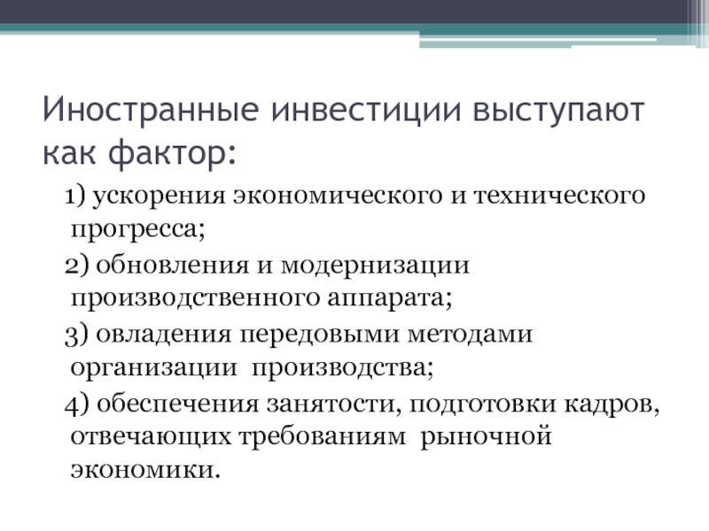 Слайд 43Иностранные инвестиции выступают как фактор: