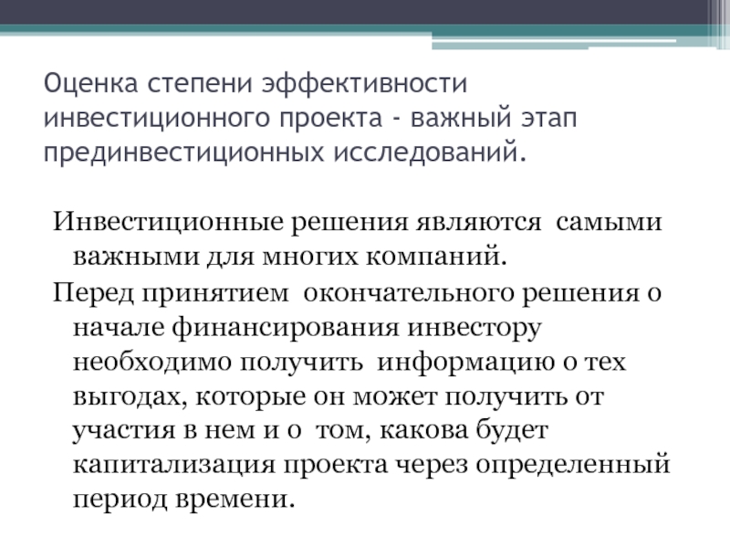 Слайд 48Оценка степени эффективности инвестиционного проекта - важный этап прединвестиционных исследований.