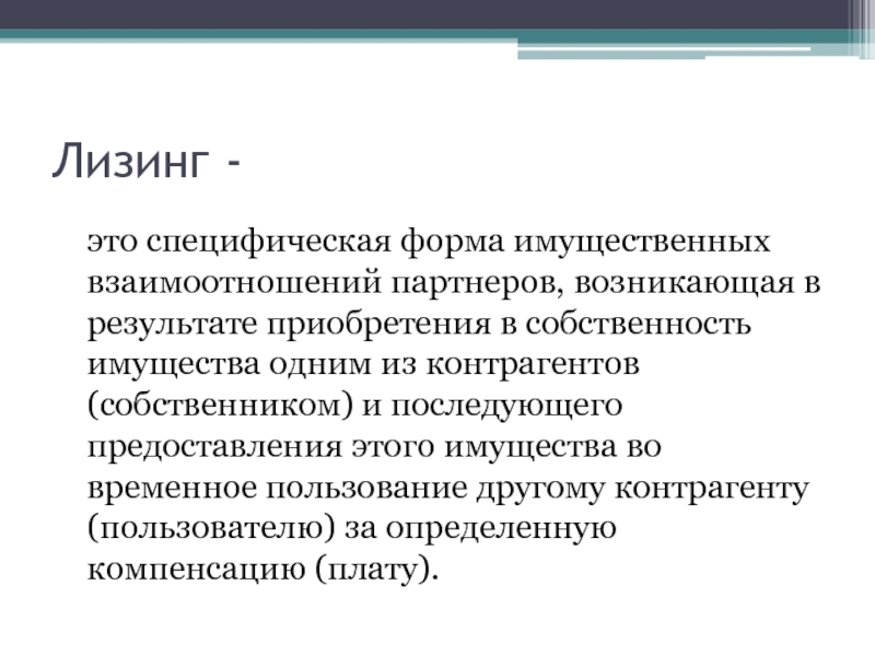 (собственником) и последующего предоставления этого имущества во временное пользование другому контрагенту (пользователю) за определенную компенсацию (плату).