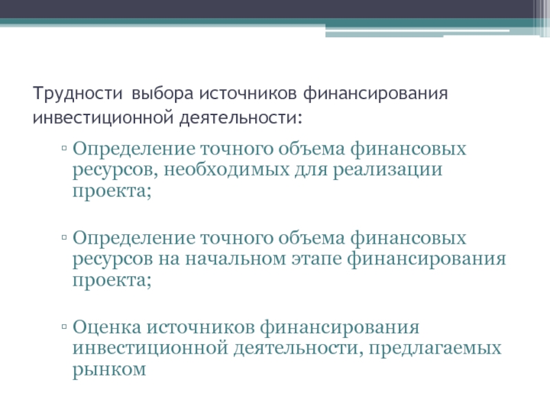 Слайд 47Трудности выбора источников финансирования инвестиционной деятельности: